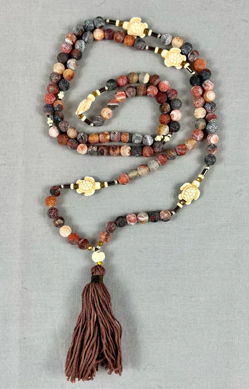 These malas are made of glass, semiprecious stones, bone, metal, and shell beads
